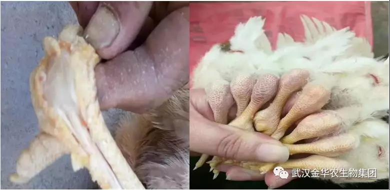 劉姐開始用替米考星加上鹽酸多西環素用了10天,效果不理想,后來加了4天強力霉素和泰勒菌素,癥狀減輕但是腫脹依舊明顯,出現了越來越多的癱雞,極度消瘦,精神沉郁的病雞。劉姐晚上翻來覆去睡不著,翻閱網上各種資料,后來看到有一個產品叫“滑囊藍金”方案還不錯,就抱著試試的態度在網上找到了華中農業大學校企合作單位---武漢金華農生物科技有限公司,禽病技術專家姚教授、趙教授確診為滑液囊支原體后推薦劉姐使用“滑囊藍金”方案。連用7天一療程。