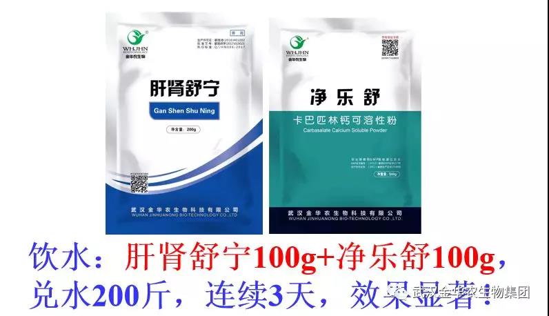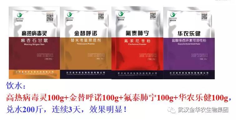 1、【白天控水】,集中4小時內喝完,飲水:高熱病毒靈100克+金替呼諾100克+氟泰肺寧100克+華農樂健100克,兌水200斤,連續3天,效果明顯!