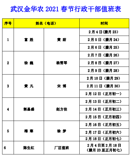 ? ? ? ?一、值班熱線持續開通:春節假日期間,公司每日安排專人值班,技術部、運營部、人事部等辦公電話和微信平臺保持暢通,為全體武漢金華農同仁及廣大客戶提供實時在線服務: