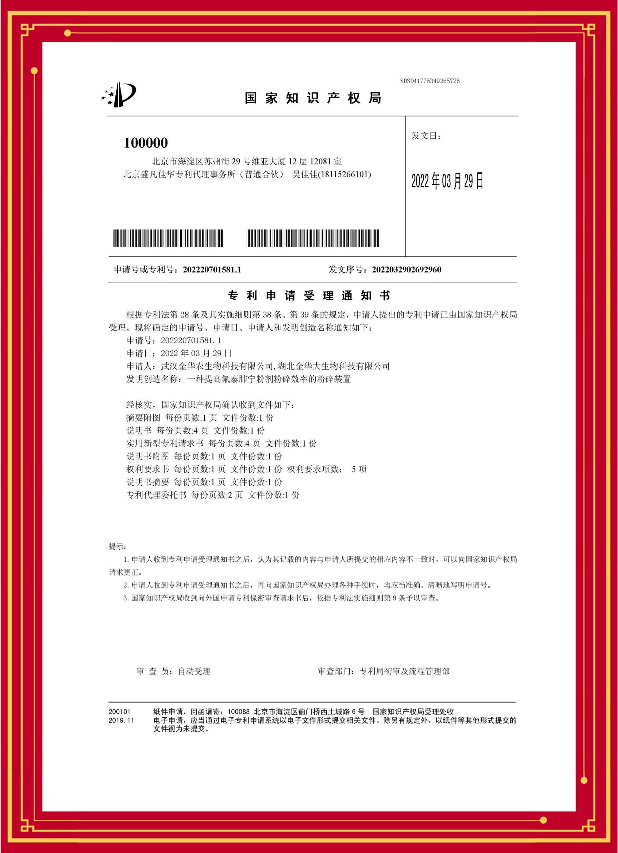 科技發(fā)明專利(氟泰肺寧):專利號(hào)—20220701581.1