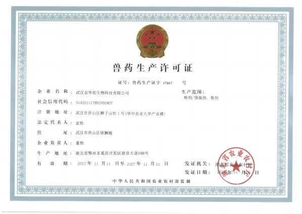 武漢金華農(nóng)獸藥生產(chǎn)許可證號:獸藥生產(chǎn)證字17067號