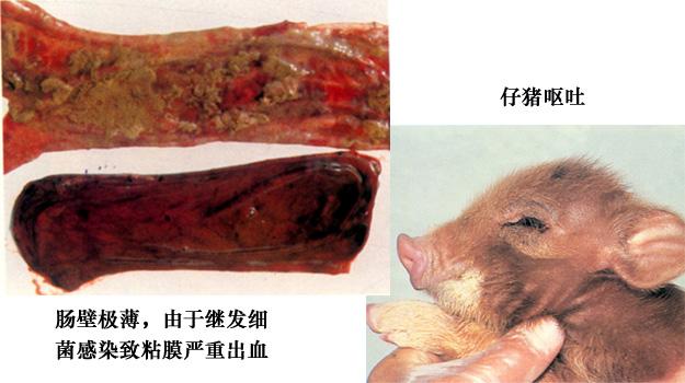 當泌乳母豬發病后泌乳量會大大下降,致使哺乳仔豬得不到充足的乳汁,仔豬營養會嚴重失調,仔豬的病情也會愈發嚴重。在臨床中,某些仔豬發病前先呈現體溫升高,隨后發生腹瀉,體溫又下降的情況。隨著日齡增長,仔豬病的死率逐漸降低。