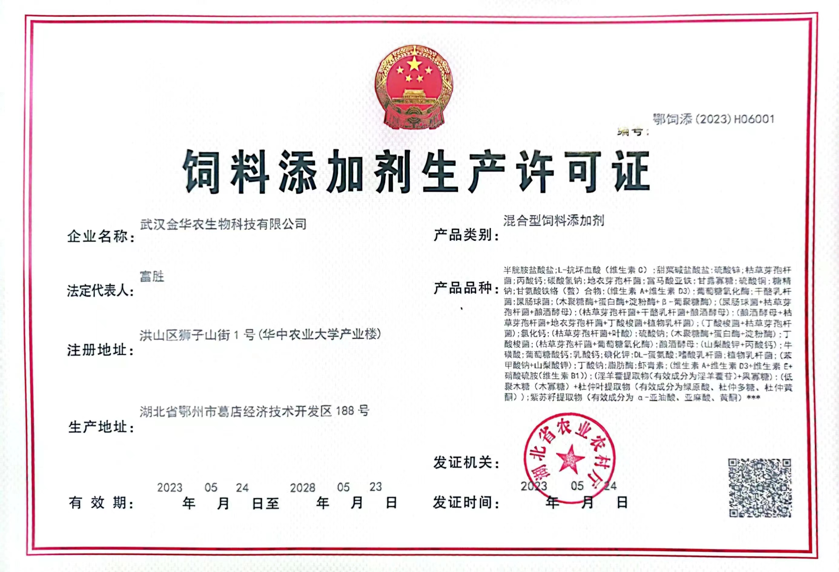 2023年5月24日,武漢金華農生物科技有限公司(下文簡稱“武漢金華農”)混合型飼料添加劑新生產線正式獲得湖北省農業農村廳頒發的“鄂飼添(2023)H06001生產許可證”和新的飼料添加劑45個新品種,這將進一步完善公司產品的功能性覆蓋、進一步擴大市場占有率、進一步促進武漢金華農的產業升級擴容。