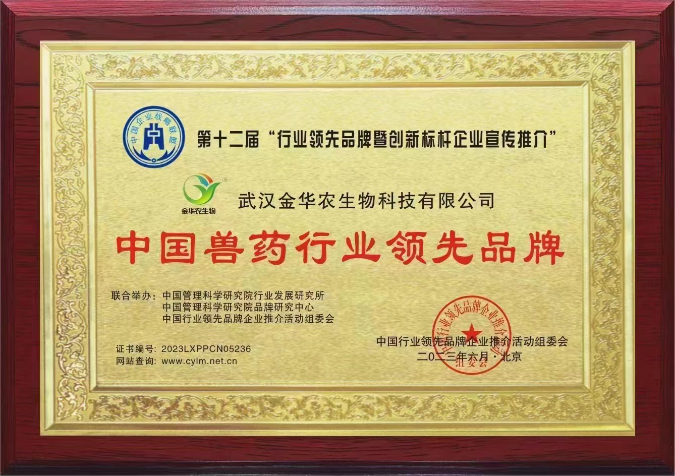 卯兔年未過半,武漢金華農已迎來諸多利好消息。公司業績突飛猛進,銷量翻番;公司獲得省農業農村廳第一批新版GMP獸藥文號、飼料添加劑45個新品種批號;公司憑借專業技術、創新發展、高效服務,被國家信用平臺、品牌強國計劃評選為“獸藥飼料添加劑行業典范企業”。近日,公司又在中國科學研究院組織的全國自主品牌研發、科研創新產品、質量品控管理、高校產學研基地建設的評選活動中,經嚴格篩選,層層選拔,考核評比,監督審查,被中國科學研究院組委會授予“中國獸藥行業領先品牌”榮譽稱號。