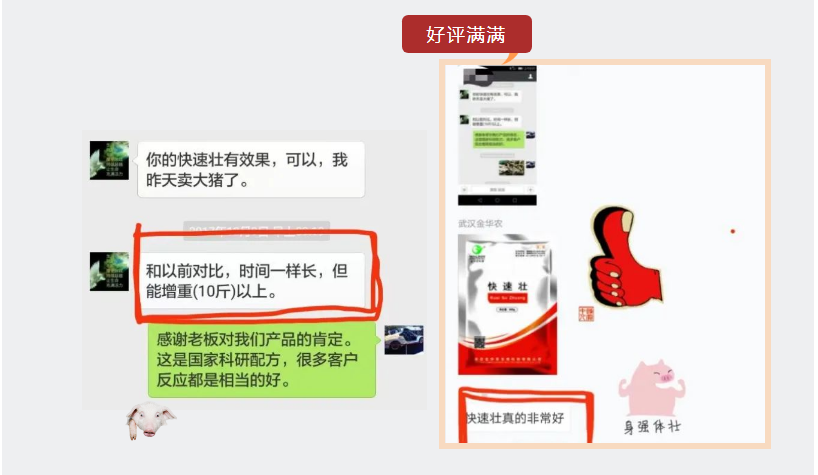 ? ? ?(2)阜陽本地區(qū)的養(yǎng)殖戶對公司專利產(chǎn)品“快速壯”十分認可,市場銷量非常好,經(jīng)養(yǎng)殖戶反饋,使用“快速壯”不到一周的時間,豬群食欲大增,采食量增加。使用半個月,豬只后驅明顯豐滿,豬毛發(fā)亮。經(jīng)對比,同時期出欄的豬群,用了“快速壯”的養(yǎng)殖戶一頭豬可以多賣300塊錢。張老師家的幾百頭牛也長期使用“快速壯”,能促進多余的營養(yǎng)成分轉化為脂肪,改善肉質、增強瘤胃動力,育肥牛能多增重20-25斤,提前出欄。母牛妊娠期間使用“快速壯+奶倍加”黃金組合,能快速提高母牛的產(chǎn)奶量,延長泌乳高峰期,同時可以促進小牛的生長發(fā)育。