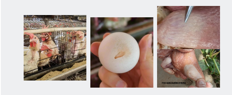 ? ? ? (1)寧經(jīng)理所在區(qū)域禽類養(yǎng)殖較多,近日接到廣西某禽類養(yǎng)殖場求助,說目前部分日齡300天的雞出現(xiàn)了雞冠蒼白、雞冠薄、倒冠,產(chǎn)蛋率由96%下降到85%,蛋殼質量差、破殼蛋、薄殼蛋多的癥狀。經(jīng)剖檢發(fā)現(xiàn)雞腎臟萎縮、肝臟萎縮,卵泡數(shù)量減少,輸卵管子宮部末端有白色病變,同日將檢測圖譜、剖檢情況上報武漢金華農(nóng)生物公司技術診斷中心,初步確診為雞傳染性貧血病與滑液囊支原體混感,立即給出控制方案:金替呼諾+華農(nóng)樂健+金泰樂欣,3天后回訪,雞群采食量上升,狀態(tài)明顯好轉,呼吸道減輕,癱雞減少,10天后蛋層上升2.5個點。