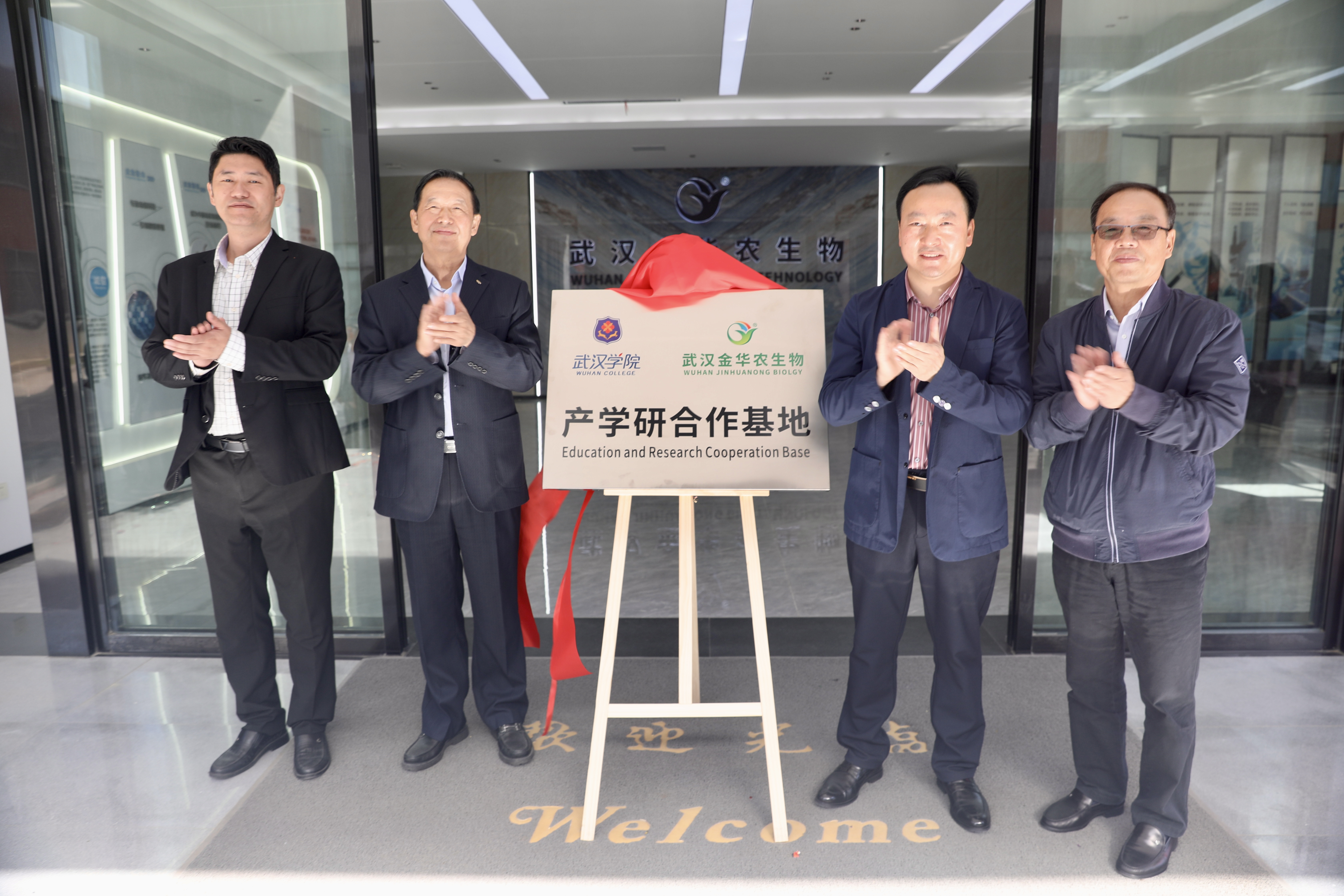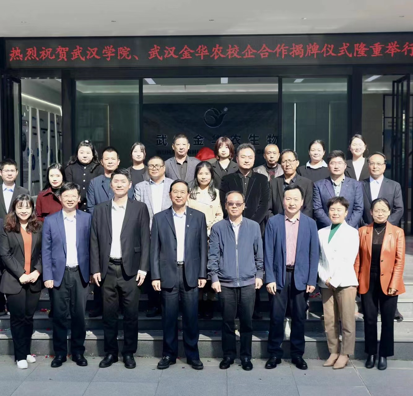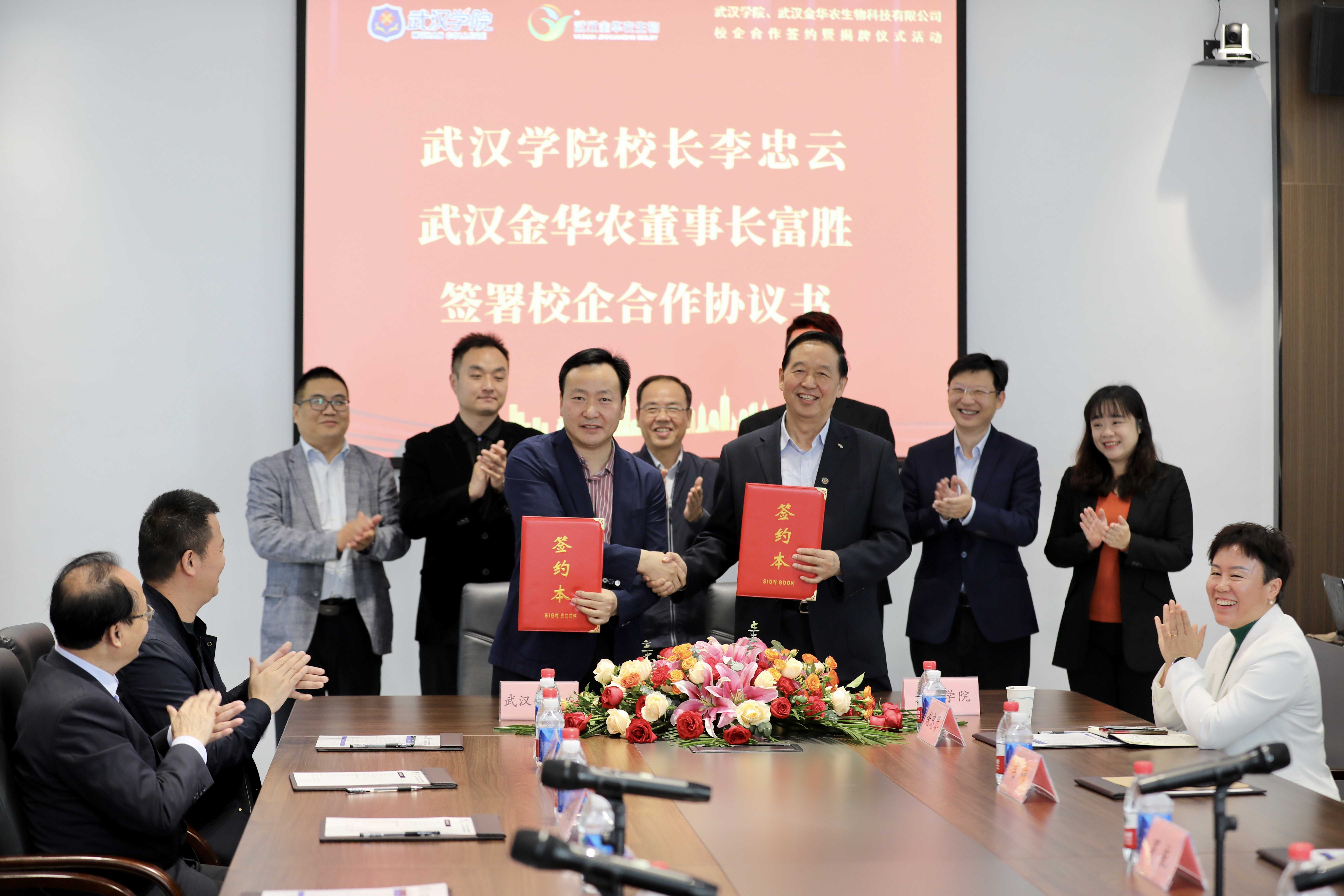 武漢學院校長李忠云、副校長羅航、管理學院院長李延暉、教務處處長韋瑋、金融與經濟學院副院長周利、教務處副處長謝忠琴、學生工作處副處長戚蘭,武漢金華農生物公司董事長富勝、副總經理黃凡、市場總監郭昌盛、人事總監梅寒、技術總監吳志良、湖北分公司總經理劉總、山東分公司總經理徐總及公司相關代表出席簽約儀式。會議特邀原湖北省總工會黨組書記、常務副主席馬建中參加見證簽約揭牌儀式。