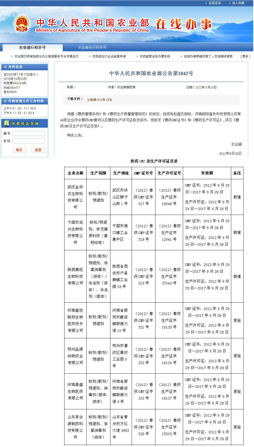 國家農業部第1842號公告:武漢金華農生物新廠區榮獲獸藥研發生產資質