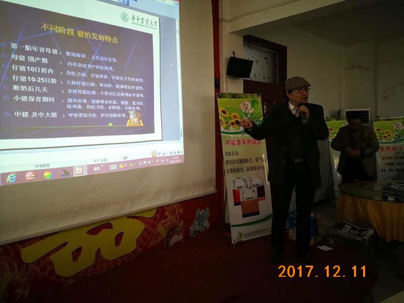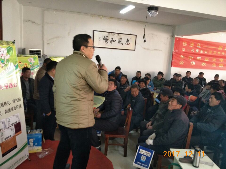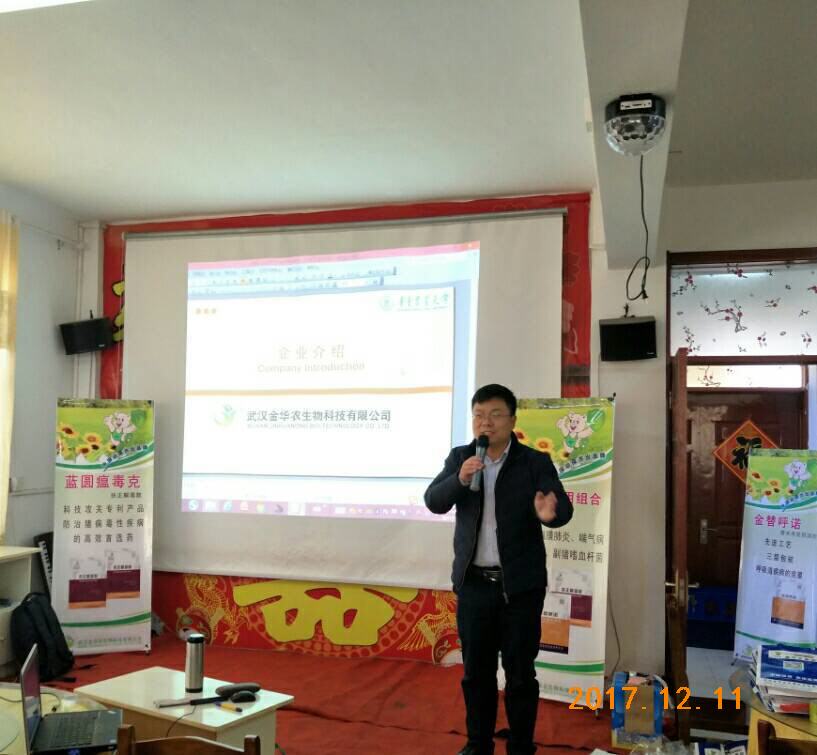 2017年12月11~12日,武漢金華農生物“山東莒南冬季豬病防控與研討交流會”在山東臨沂地區勝利召開!公司領導徐巍副總經理、技術部吳老師、大區負責人劉經理參加本次會議,會議聽課豬場人數120多人,會議達到預期目的,豬病知識授課圓滿,養豬戶學習積極認真。