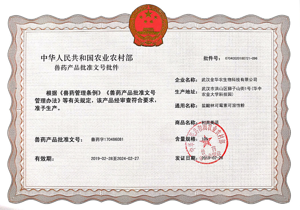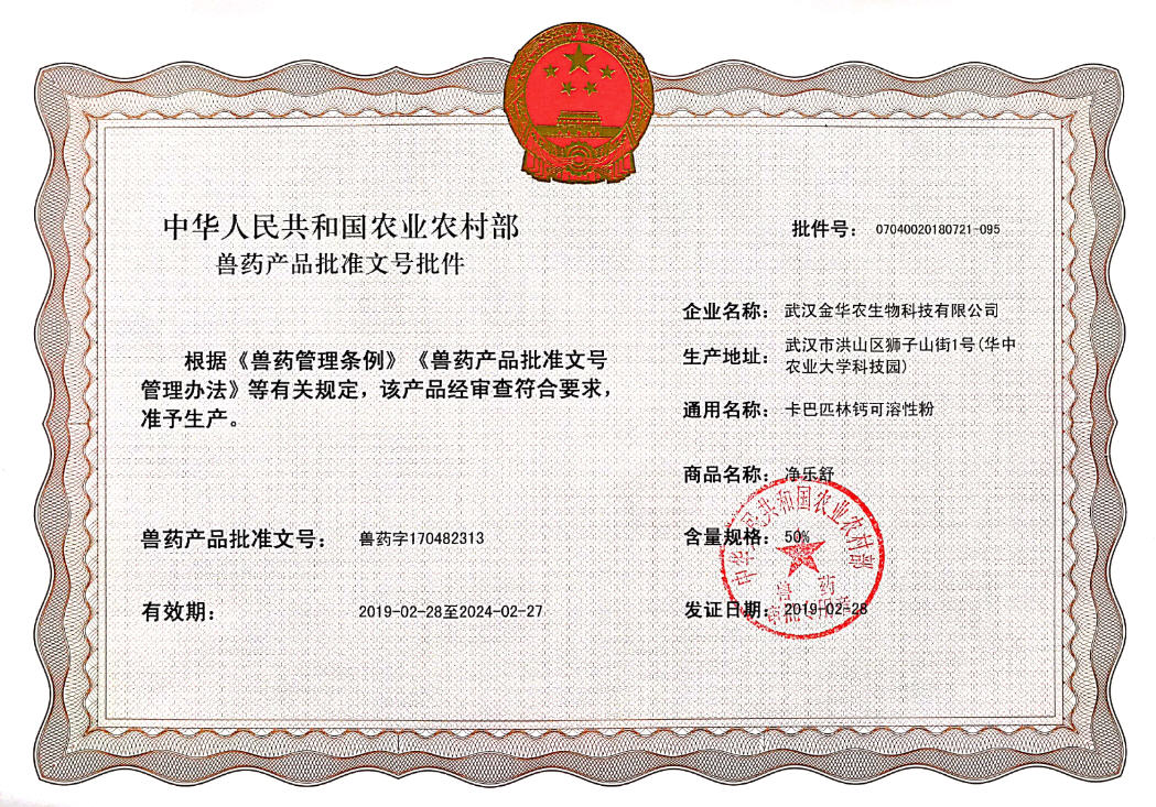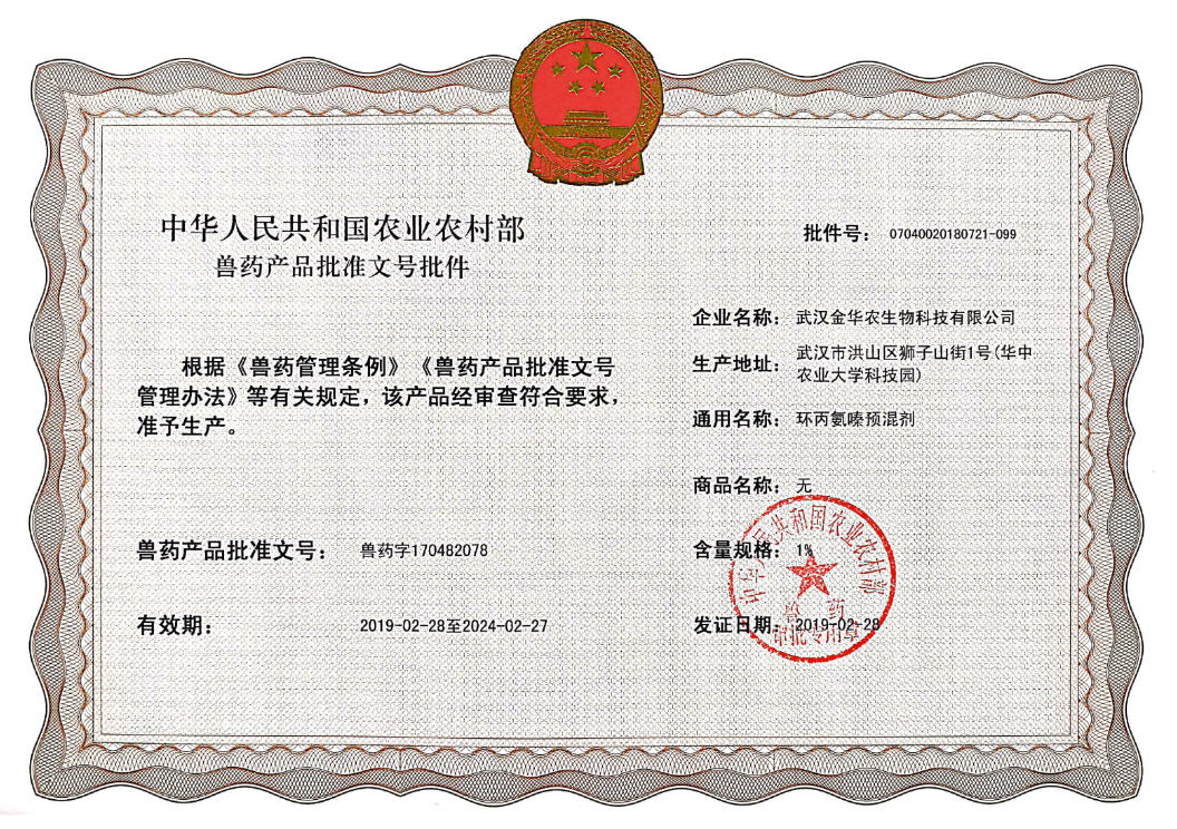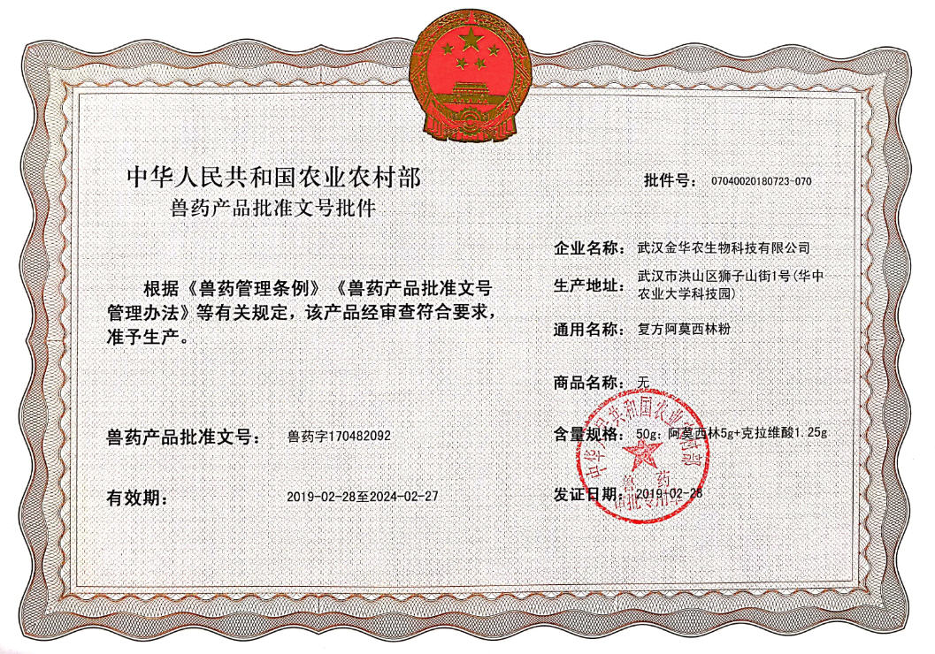 截止2019年3月7日,公司申報(bào)國家農(nóng)業(yè)農(nóng)村部的多個(gè)獸藥批文批號,“克拉美林500g”(復(fù)方阿莫西林),“凈樂舒500g”(卡巴匹林鈣)、“利高美諾500g”(鹽酸林可霉素),“蠅蛆凈500g”(環(huán)丙氨嗪預(yù)混劑)等4個(gè)產(chǎn)品,獲得農(nóng)業(yè)農(nóng)村部高度認(rèn)可,并正式榮譽(yù)頒發(fā)證書、也成為“馳名商標(biāo)+杰出品牌”,值此收獲之際,感謝各位養(yǎng)殖老板們對武漢金華農(nóng)動(dòng)保產(chǎn)品的長期信任與贊美!好獸藥,武漢金華農(nóng)造!